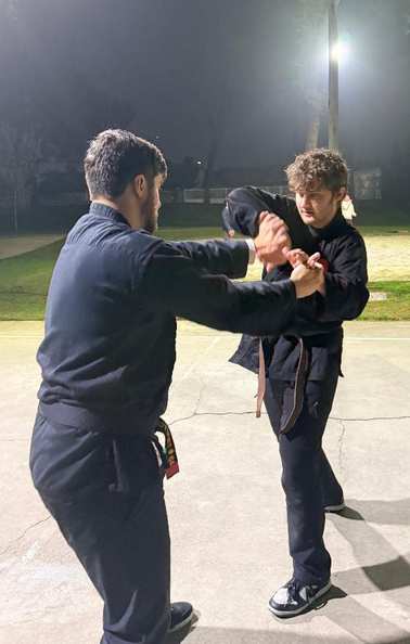 Demonstrating “KIA Short Stick” above and his fighting position below.